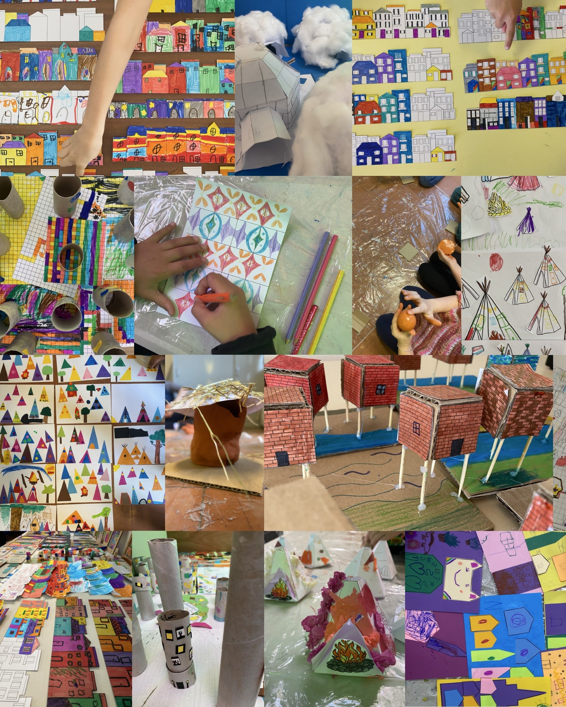 Sur une année scolaire, les enfants expérimentent plusieurs médiums et matériaux pour assimiler et s'approprier les différentes manières d'habiter dans le monde, et dans un même pays. Coloriage, pliage, collage, maquette et réflexion intense sont au rendez-vous.