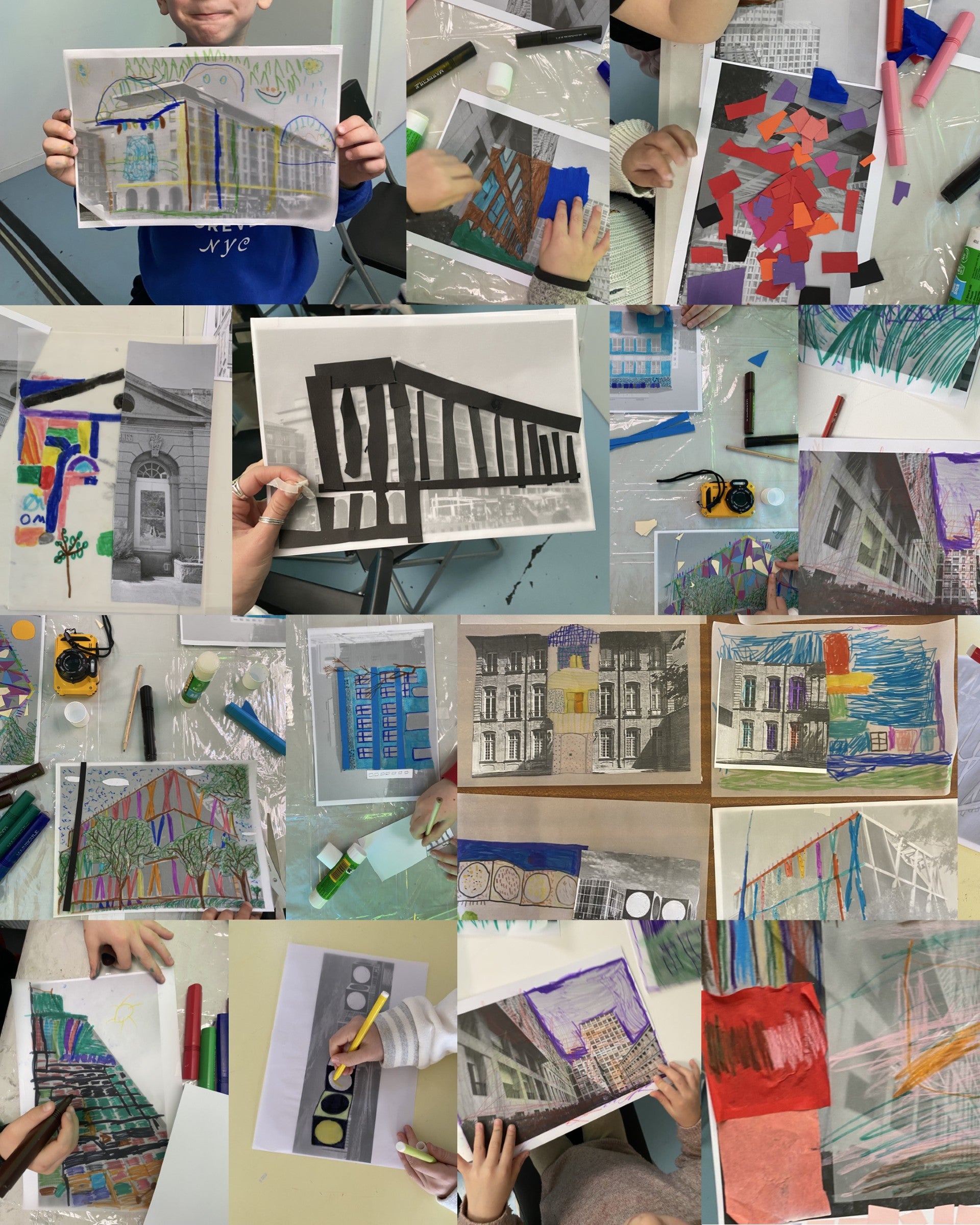 Lors d'ateliers ponctuels, les enfants prennent plaisir à s'approprier des façades qu'ils voient tous les jours, dans leur quotidien, en ajoutant couleurs et motifs. Cela permet de parler du bâtiment, de son architecte, de sa forme et de ses usages tout en s'amusant à réinventer une ville toujours plus joyeuse.